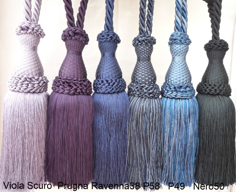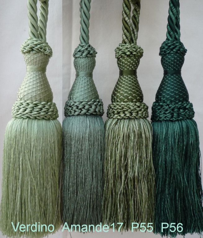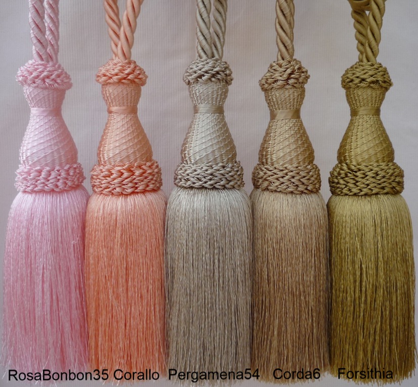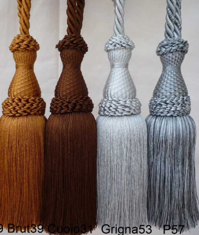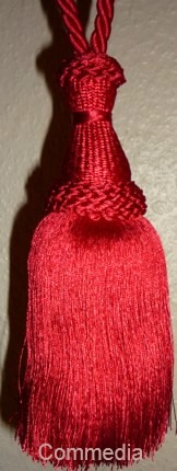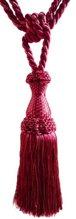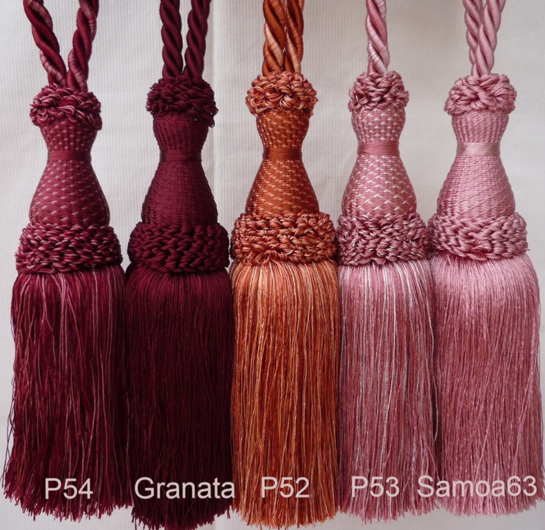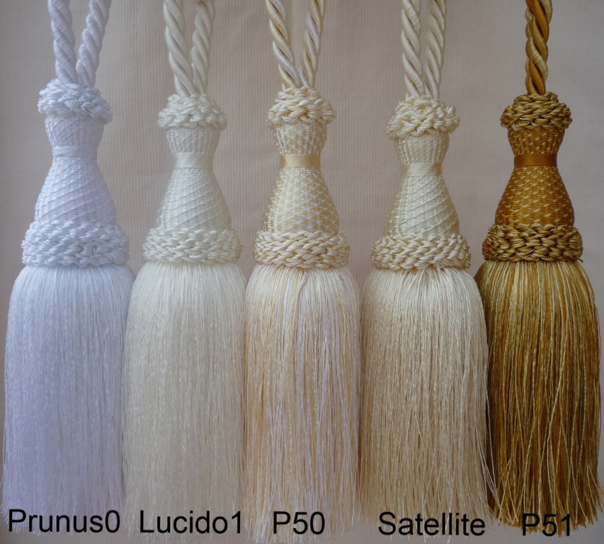 Raffhalter mit 1 Quaste aus glänzender Kunstseide in großer Farbauswahl, Quaste ca.20cm groß, Spannweite des Raffhalters ca.80cm.